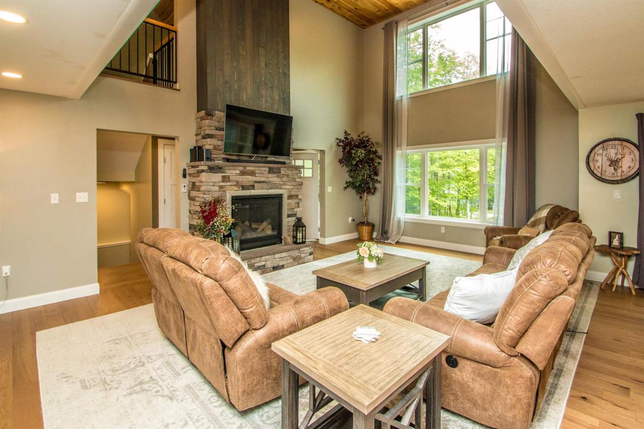 Spacious living room with a cathedral ceiling and toasty fireplace
